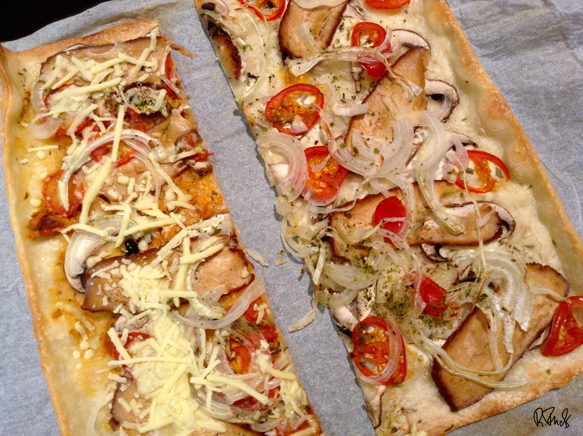 Flammkuchen ist ein schnelles Gericht und jeder bekommt seinen Anteil je nach Gusto belegt